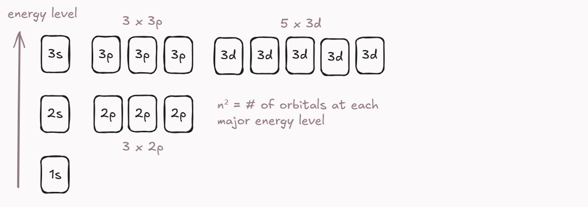 * Energy levels (n) to possible orbitals = $$n^2$$